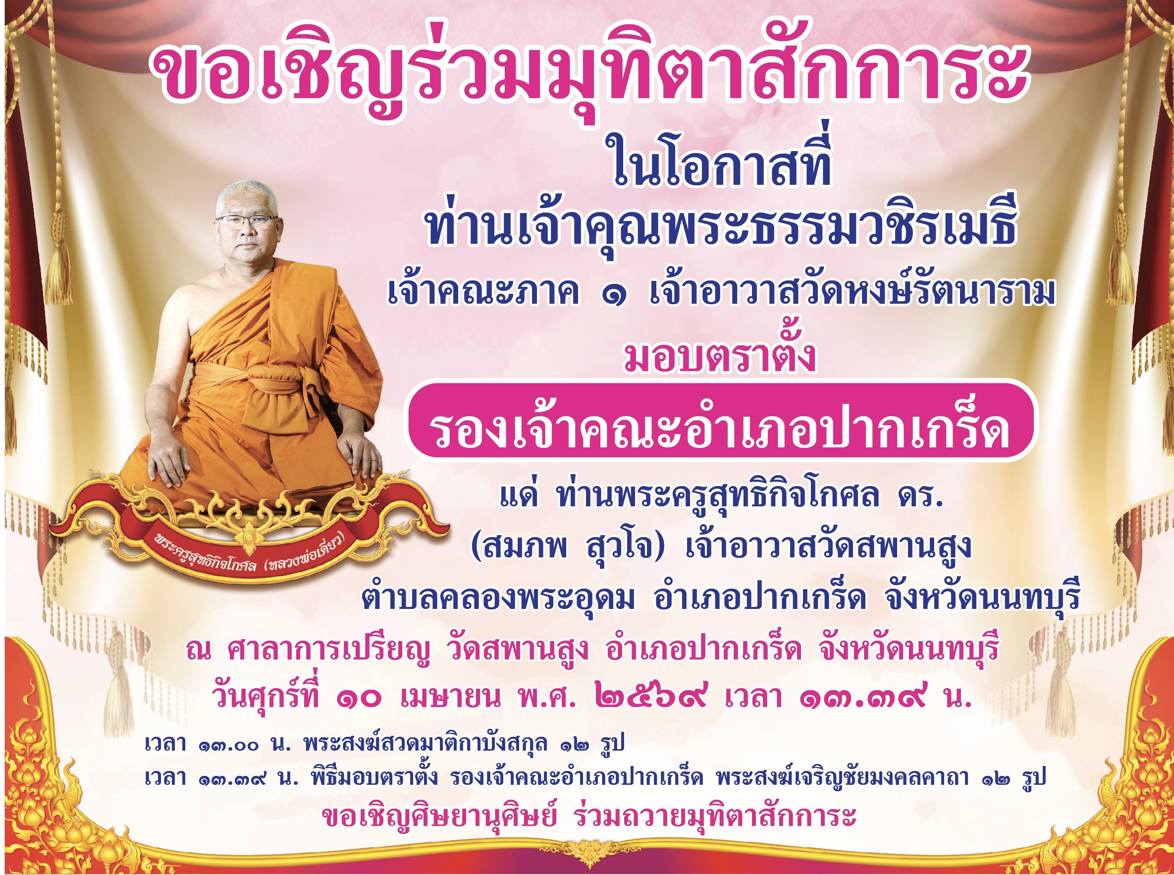 | อังคารที่ ๗ เมษายน ๒๕๖๙ | ทำบุญอุทิศถวาย พระครูนนทกิจโสภณ (ทองสุข อินทสาโร) อดีตเจ้าอาวาสวัดสพานสูง |